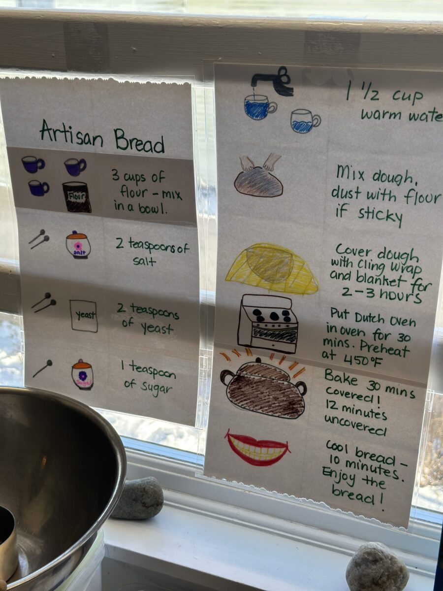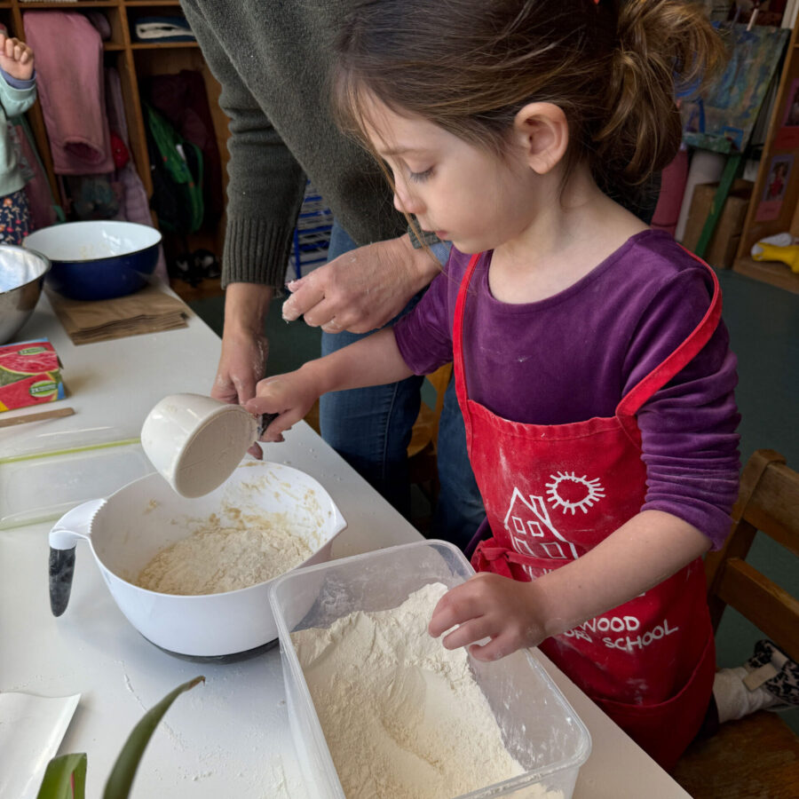 Students at King’s Wood Montessori are busy baking bread! This lesson embodies all the goals of Practical Life: order, concentration, coordination, and independence. The work is prepared by the lead teacher to give the children independence in putting together the ingredients in the proper order, mixing, and then kneading and shaping the dough (oh, what fun!). Next, of course, is clean up. Children wash the dishes, table, and countertops. The children see how the dough rises after an hour, and then we bake! The class devours the bread together at line time with a little butter or olive oil, or plain, too, and thank the children who made the delicious bread.