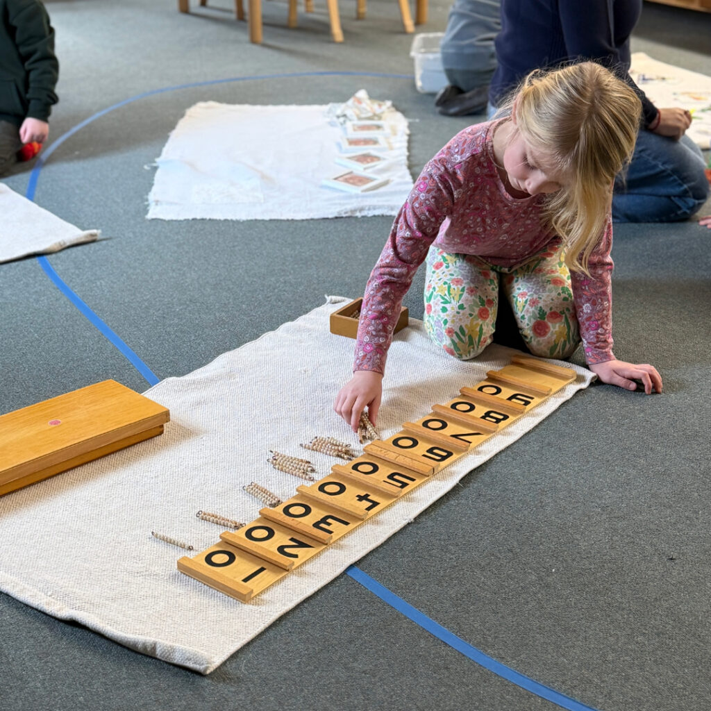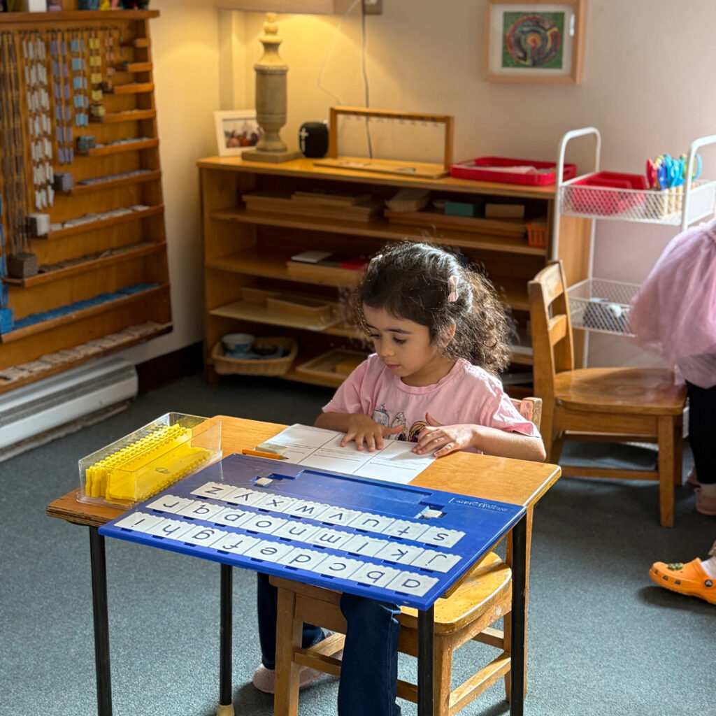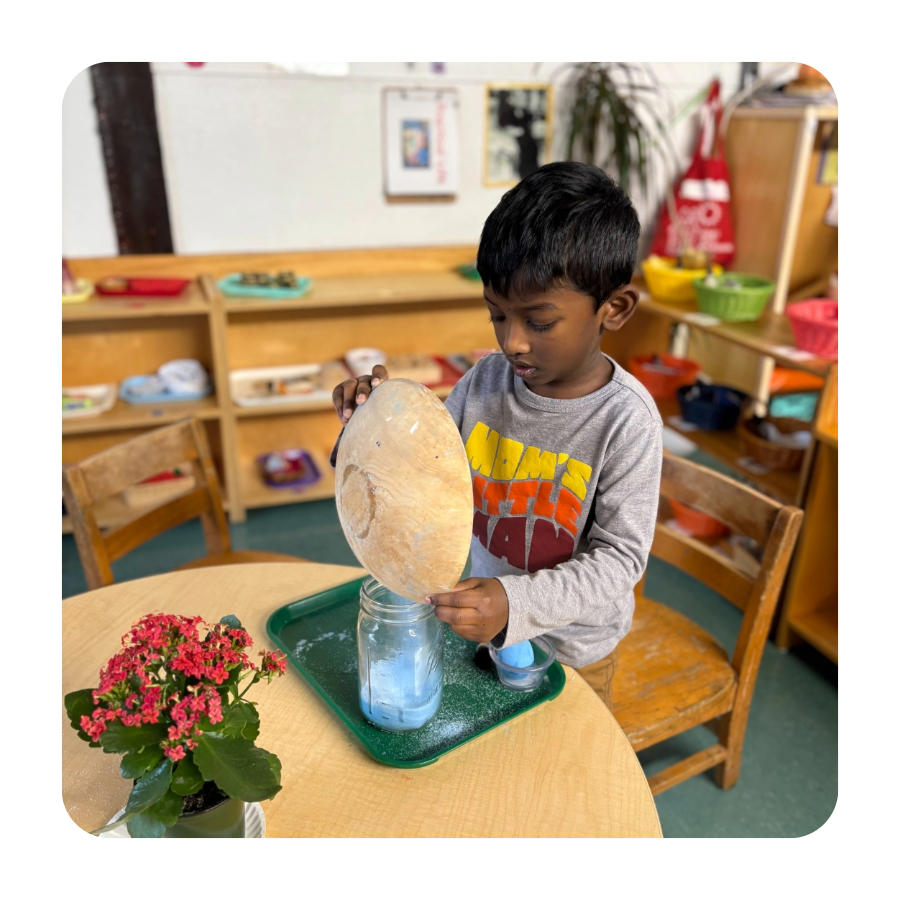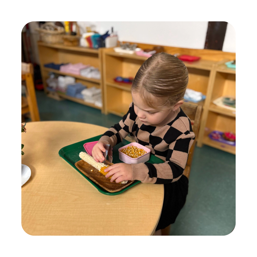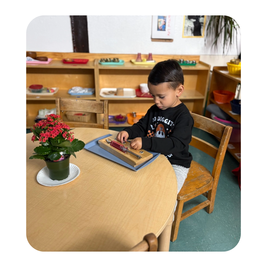 Each material teaches lessons in practical life, sensorial development, math, or language. Every activity has a clear purpose. The uninterrupted work cycle allows children to work with materials as long as needed, supporting mastery and meeting their developmental needs. Often, children enter the classroom and immediately choose activities such as knobbed cylinders, polishing, or maps, working diligently until they internalize the concept. The teacher periodically introduces new materials to keep children engaged and expand their knowledge.